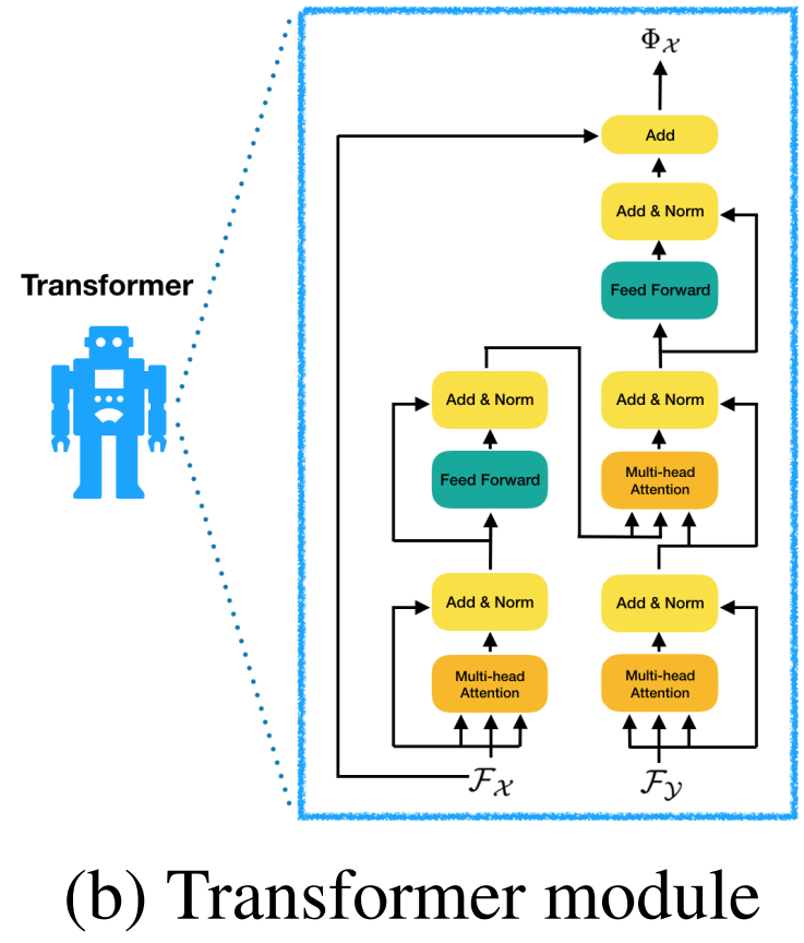 \begin{aligned} \Phi_{\mathcal{X}} &=\mathcal{F}_{\mathcal{X}}+\phi\left(\mathcal{F}_{\mathcal{X}}, \mathcal{F}_{\mathcal{Y}}\right) \\ \Phi_{\mathcal{Y}} &=\mathcal{F}_{\mathcal{Y}}+\phi\left(\mathcal{F}_{\mathcal{Y}}, \mathcal{F}_{\mathcal{X}}\right) \tag{1}\end{aligned}这里面,我们将函数 \phi 看做是一个残差,通过由 \mathcal{F}_{\mathcal{X}} 和 \mathcal{F}_{\mathcal{Y}} 学习到的关系,对于原有的 Embeding 进行的改变。这里的逻辑是,通过这样的映射 \mathcal{F}_{\mathcal{X}}\mapsto\Phi_{\mathcal{X}},\Phi_{\mathcal{X}} 不仅包含了原始点云 \mathcal{X} 的特征,同时也包含了目标点云 \mathcal{Y} 中结构的知识,因此对于我们所要进行的点云配准任务是更加有利的。反之同理。