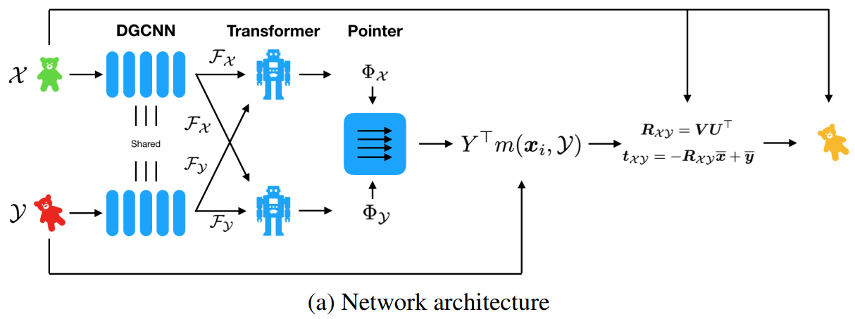 参照经典的使用 SVD 求解 ICP 问题的流程,我们采用神经网络提取特征,并且使用注意力机制,最终使用一个可导 SVD layer 进行求解(在 PyTorch 和 Tensorflow 都提供了这样的 Layer)。整体网络结构框架如下图所示: