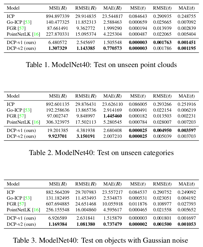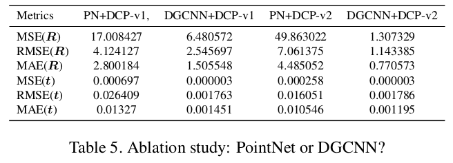 这篇文章从 SVD 求解 ICP 问题的细节原理出发,针对 ICP 问题定制了网络模型,分析非常细致而且也做了比较充足的实验,比如比较 PointNet 和 DGCNN 效果,MLP 与 SVD 求解姿态效果,都能够证明本文方法的有效性。