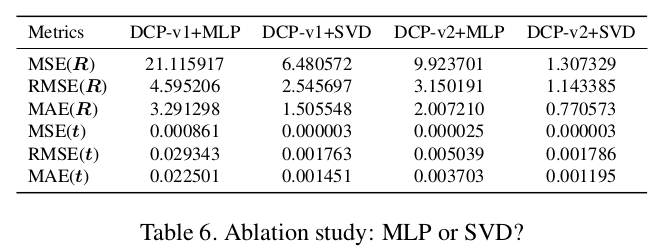 很多基于 Deep Learning 方法的 Pose 回归直接使用 MLP,其实这样很不科学,但是似乎也很 work。作者也对 MLP 和 SVD 方法进行了对比,结果表明更加科学的 SVD 明显具有更好的精度(所以不要搞什么 MLP 回归 Pose 的东西了)。