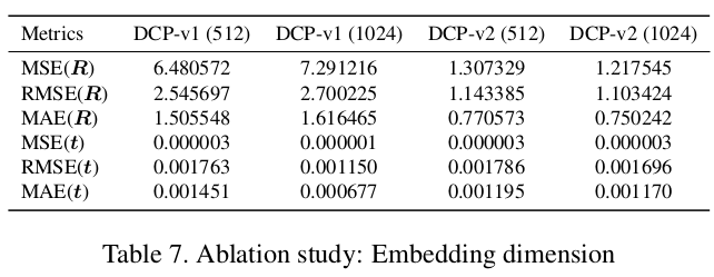 对于 Embedding 维度作者也进行了对比,结果表明对于 DCPv1 维度从 512 提升到 1024 效果有更明显提升,但是 DCPv2 提升不明显。