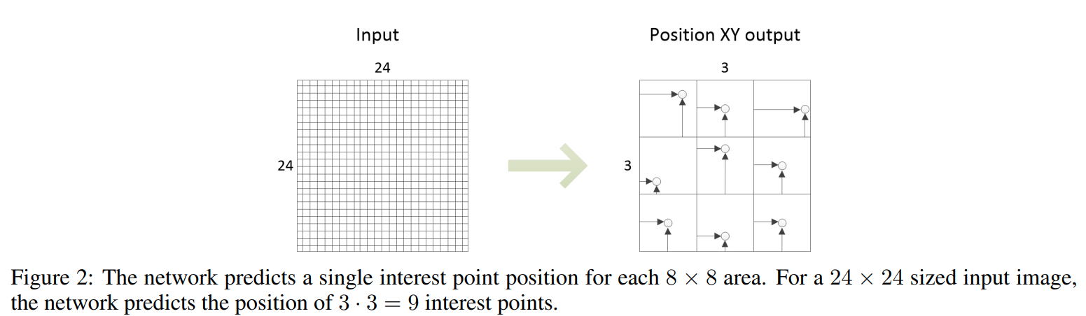 Position module 预测关键点的位置。与 SuperPoint 采用分类方式(64 channel 分别预测一个位置是否为关键点)不同,本文采用回归的方式预测一个 8x8 块内关键点的坐标偏移量 offset(归一化为 [0-1] 之间)。它的结构是 conv-256 + conv-2,激活函数是 sigmoid。如下图所示是一个 24x24 大小的图示意,对于进行了 8 倍下采样的 FCN 而言,position module 实际上预测了 3x3 = 9 的 keypoint 位置: