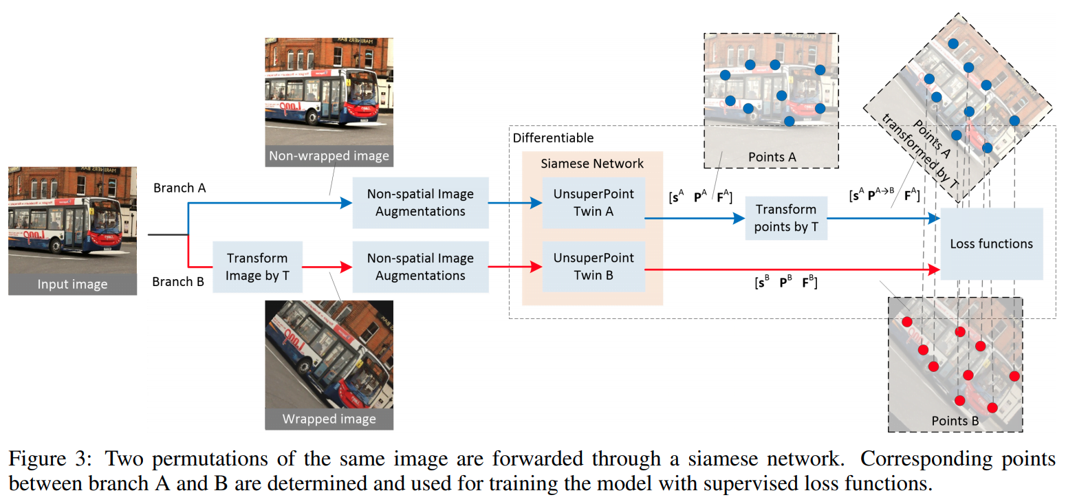 这一图示很显然,其实和监督的方式很像,就是利用图片进行 T 的 Transform,将原图进行变换,变换前后的图分别提取 score、point、feature 三个结果为 S^A、P^A 和 F^A,以及 S^B、P^B 和 F^B。对于其中点的位置进行 T 的 transform 变换到 P^B 位置,得到 Point-pair correspondences,利用匹配关系就得到了想要的无监督信号。