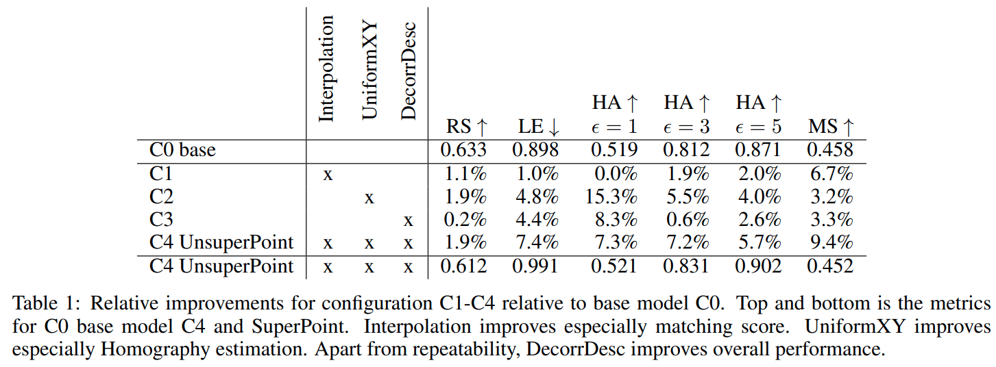 C2 表示在 detector 部分增加 Uniform point predictions,这一操作提升了 repeatability、homography 精度并降低了 localization error(对应 3.2);