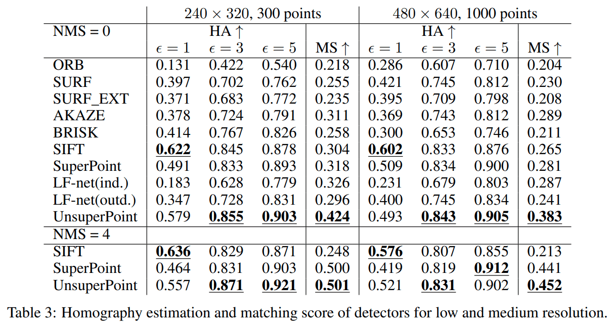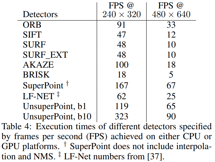 SuperPoint, UnsuperPoint and LF-Net 速度测试环境为: GPU (GeForce Titan X),其他在 CPU (Intel i7-7700HQ).