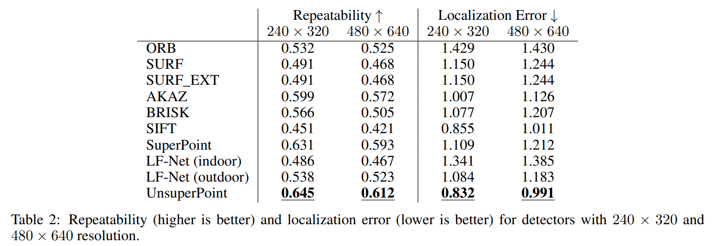 SuperPoint 的工作取得了巨大的成功,但是有一个非常明显的问题就是训练和真值获取非常困难(采用仿真辅助)。在实际场景中,想要进行人工标注再 finetune 是比较难的。因此本文提出了一种无监督学习的方式同时获得关键点与描述子,虽然无监督,但是在数据集上取得了很好效果的同时也达到了很快的速度。