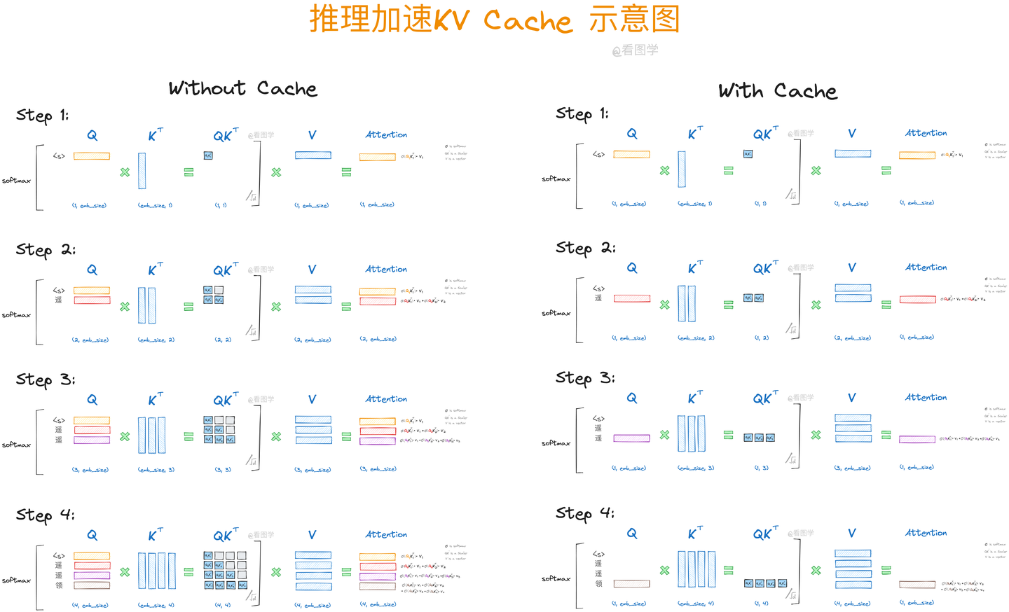 - **第 t 步**:输入 (x_1, \dots, x_t),重新计算 (K_1, V_1), \dots, (K_t, V_t)。
